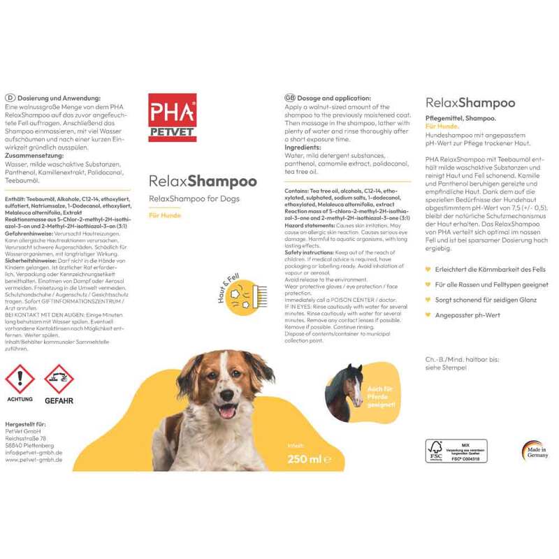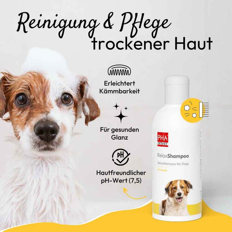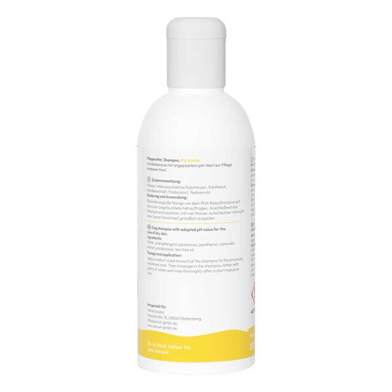 Die in PHA RelaxShampoo enthaltenen milden waschaktiven Substanzen reinigen Haut und Fell schonend. Kamille und Panthenol beruhigen gereizte, empfindliche Haut und vermeiden weitere Trockenheit und Juckreiz. Der pH-Wert von PHA RelaxShampoo ist auf die speziellen Bedürfnisse der Hundehaut abgestimmt. Hierdurch bleibt der natürliche Schutzmechanismus der Haut erhalten. PHA RelaxShampoo verteilt sich gut im nassen Fell und hat bei sparsamer Dosierung eine hohe Ergiebigkeit.