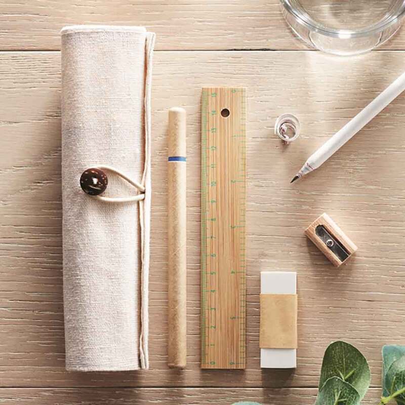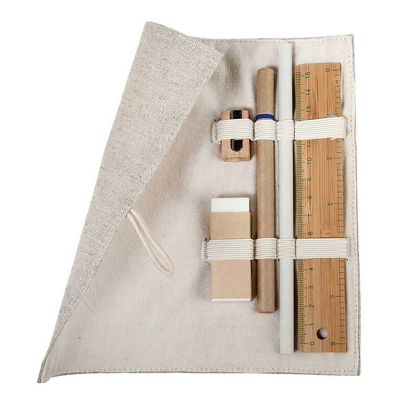 Verstauen Sie Bleistift, Kugelschreiber (mit blauer Tinte), Holz-Anspitzer, Bambus-Lineal und Radiergummi einfach in Ihrem neuen praktischen Mäppchen aus Naturmaterialien. Es lässt sich per Holzknopfverschluss schliessen und ist perfekt für Büro, Schule oder den Haushalt.