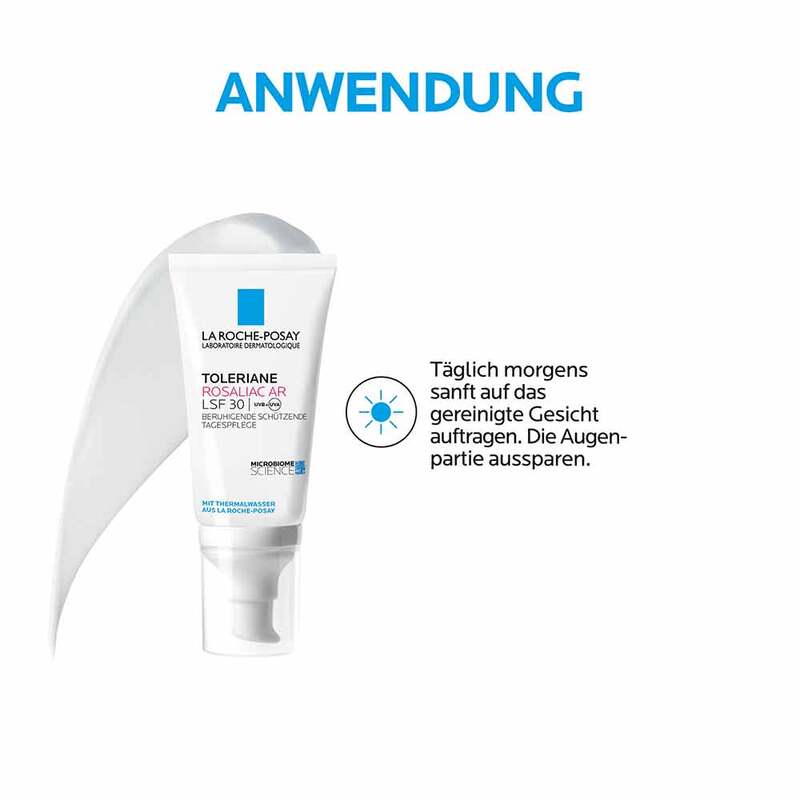 Täglich morgens und/oder tagsüber nach Bedarf die Tagescreme Toleriane Rosaliac AR LSF 30 von La Roche Posay auf die gereinigte Gesichtshaut auftragen. Vorsichtig mithilfe der Fingerspitzen die Creme mit Lichtschutzfaktor verteilen und einmassieren. Die Augenpartie aussparen.