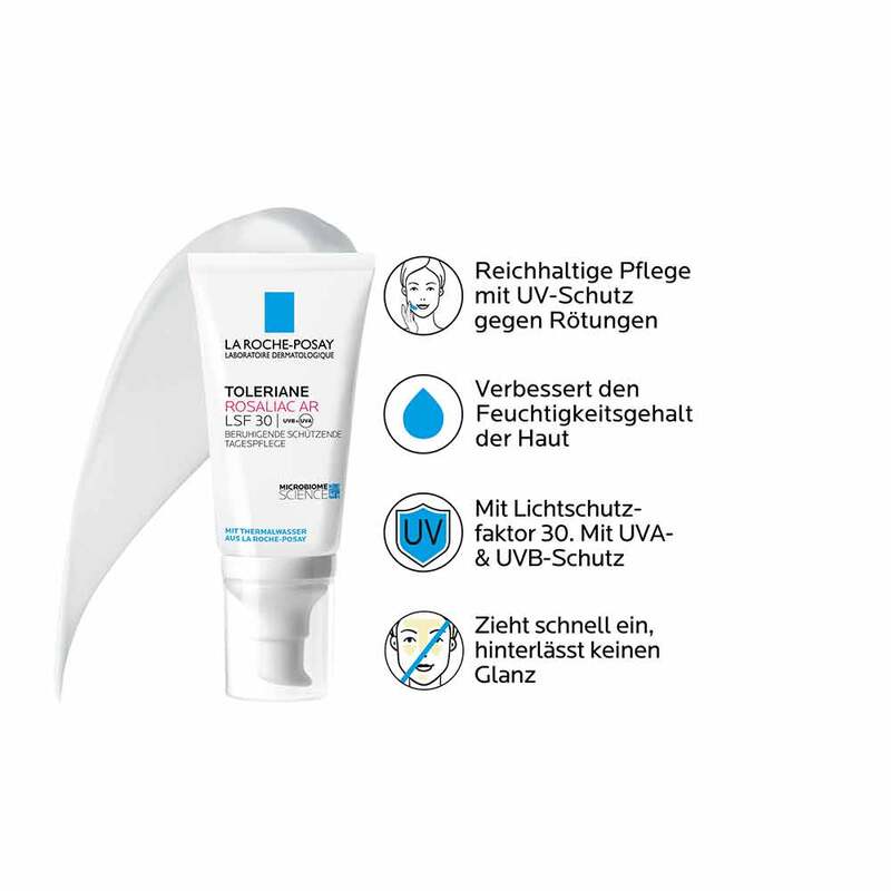 Die Toleriane Rosaliac AR LSF 30 Tagescreme mit Lichtschutzfaktor von La Roche Posay schützt die Haut vor schädlichen UV-Strahlen, die Rötungen intensivieren können. Die Formulierung enthält zudem Sphingobioma, welches die Funktion des Mikrobioms unterstützt und zusammen mit dem Thermalwasser aus La Roche-Posay für eine geschützte und gesund aussehende Haut sorgt. Glycerin bewahrt die Haut gleichzeitig vor dem Austrocknen und spendet Feuchtigkeit.