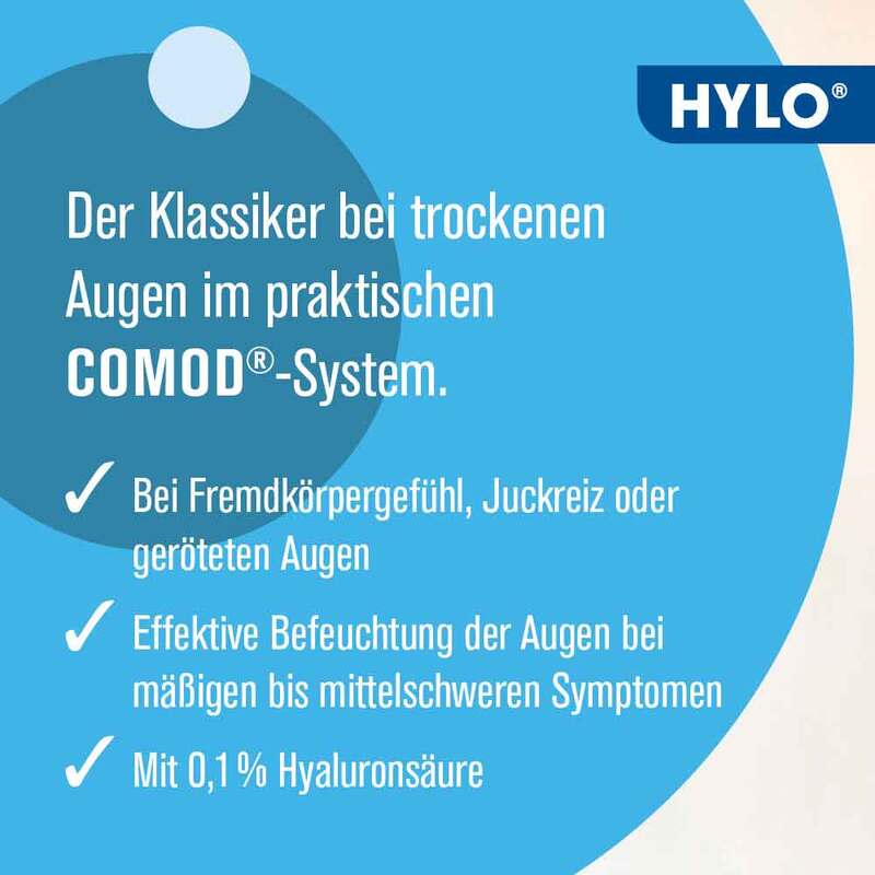HYLO COMOD® bietet langanhaltende und effiziente Hilfe bei trockenen Augen. Die befeuchtende Wirkung und besonders gute Verträglichkeit der Augentropfen haben sich millionenfach bewährt: HYLO COMOD® ist das meistangewendete Augenbefeuchtungsmittel in Deutschland.* Dank der hochviskosen, langkettigen Hyaluronsäure ermöglichen HYLO COMOD® Augentropfen eine verbesserte Befeuchtung der empfindlichen Augenoberfläche bei mäßigen bis mittelschweren Beschwerden bei trockenen Augen. Die Tropfen ergänzen den natürlichen Tränenfilm und schützen die Augen somit langanhaltend vor Schädigungen durch Austrocknung. Typische Symptome wie Rötung, Brennen, Juckreiz und Fremdkörpergefühl klingen schnell ab. Aufgrund der langanhaltenden Versorgung mit Feuchtigkeit ohne Konservierungsstoffe oder Phosphate eignet sich das Medizinprodukt auch vor und nach operativen Eingriffen am Auge, wenn die Versorgung mit ausreichend Tränenflüssigkeit gestört ist.