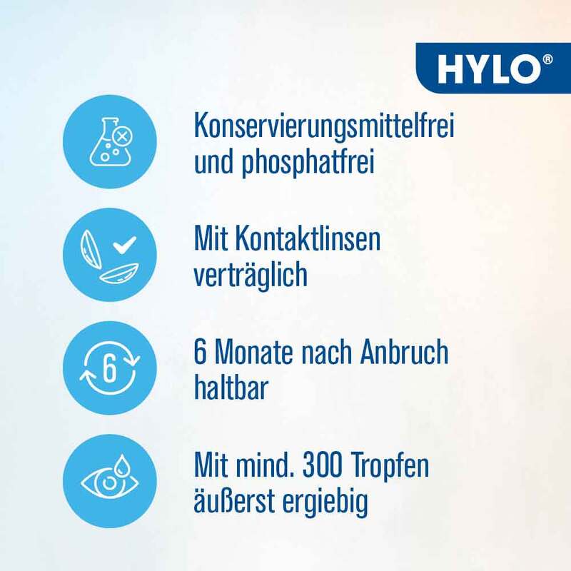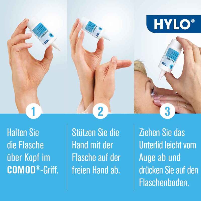 Zum Schutz empfindlicher Augen sollten Augentropfen gut verträglich und frei von krankheitserregenden Keimen sein. Herkömmliche Augentropfen verwenden deshalb meist Konservierungsstoffe, die jedoch Unverträglichkeiten und Allergien hervorrufen können. Die Medizinprodukte der HYLO® Produktfamilie werden im innovativen COMOD® System angeboten. Die Augentropfen sind steril und luftdicht verschlossen, auf Konservierungsmittel kann deshalb verzichtet werden. Zusätzlich punktet das patentierte System mit exakter Dosierung: Pro Pumpstoß tritt nur 1 Tropfen aus. Ein Fläschchen ist nach Anbruch 6 Monate haltbar und reicht für mindestens 300 Tropfen.