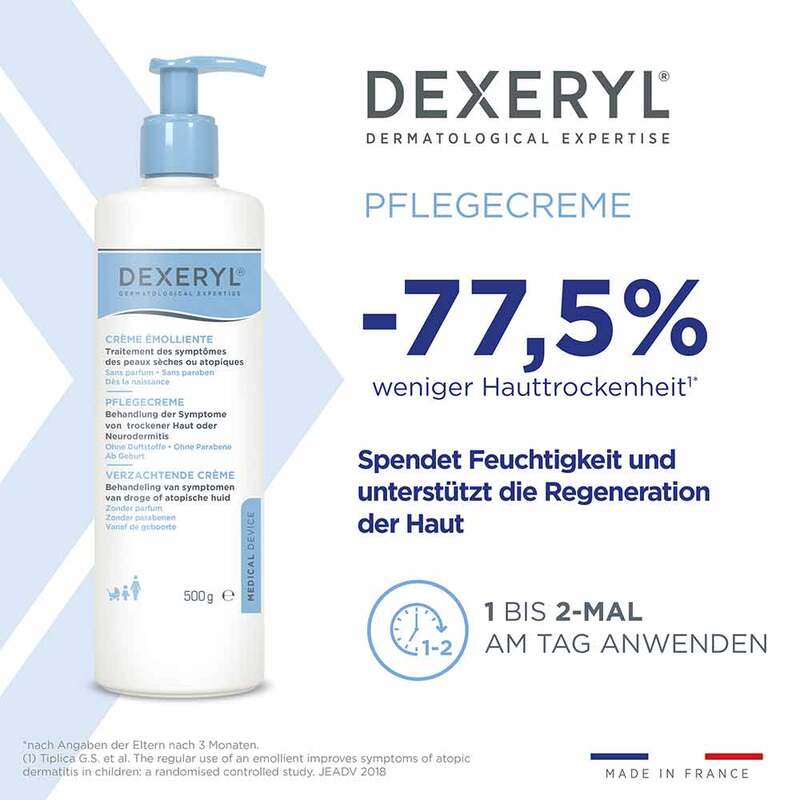 Die Dexeryl Pflegecreme 250-Gramm-Packung ist eine intensiv feuchtigkeitsspendende Hautpflegecreme. Sie wurde speziell für die Bedürfnisse von trockener Haut sowie für Personen mit Hauterkrankungen wie Neurodermitis und Ichthyose entwickelt. Die medizinische Hautpflegecreme versorgt die Haut nachhaltig mit Feuchtigkeit und unterstützt die Wiederherstellung der natürlichen Schutzbarriere der Haut. Sie eignet sich für den täglichen Gebrauch bei Erwachsenen und Jugendlichen. Sogar für Kleinkinder und Säuglinge ist die Creme geeignet.