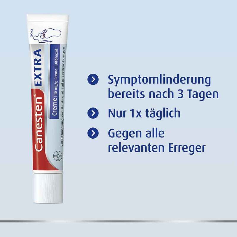Pilzerkrankungen an Haut und Fuß bekämpfen – mit Canesten® EXTRA CremeCanesten® EXTRA Creme bekämpft zuverlässig Pilzerkrankungen der Haut und Füße. Im Gegensatz zu vielen anderen Pilzmitteln muss die Canesten® EXTRA Creme nur einmal täglich angewendet werden und zieht zügig in die Haut ein.