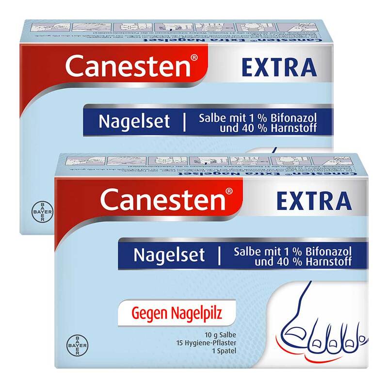 - Die 2-Phasen-Kurztherapie mit der Kombination aus dem Canesten® EXTRA Nagelset und der Canesten® EXTRA Creme bekämpft Nagelpilz schnell, gründlich und effektiv.