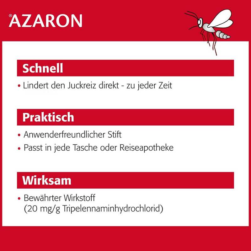 Azaron®Wirkstoff: Tripelennaminhydrochlorid. Anwendungsgebiete: Zur Linderung oder symptomatischen Beseitigung von Juckreiz nach Insektensti-chen oder -bissen und nach Kontakt mit Quallen oder Brennnesseln Enthält Propylenglycol. Packungsbeilage beachten! Zu Risiken und Nebenwirkungen lesen Sie die Packungsbeilage und fragen Sie Ihre Ärztin, Ihren Arzt oder in Ihrer Apotheke. Stand 10.2020