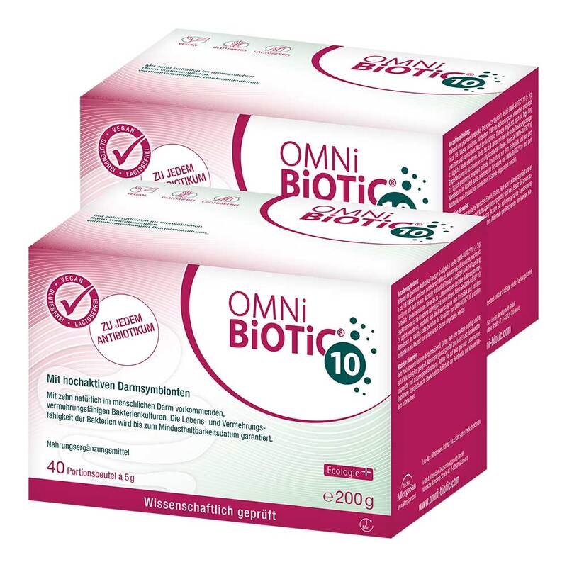 Während der gesamten Anitbiotika - Therapie 2 x täglich 1 Beutel Omni Biotic 10 (= 5 g) in 1/8 l Wasser einrühren, mindestens 1 Minute Aktivierungszeit abwarten, nochmals umrühren und dann trinken. Nach der Antibiotika - Therapie möglichst noch 14 Tage lang 1 x täglich 1 Beutel einnehmen.