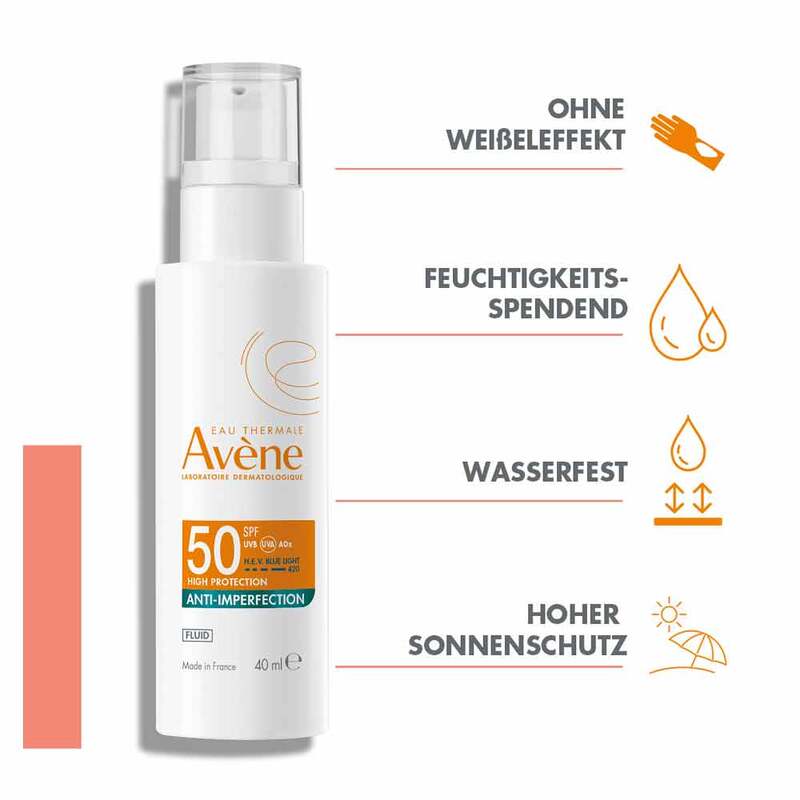 Das Anti-Unreinheiten Fluid LSF 50 von Eau Thermale Avene ist ein Sonnenschutzprodukt für empfindliche und zu Akne neigender Haut. Es mattiert und verfeinert die Poren, reduziert den Talgüberschuss und schützt die Haut vor UVB, UVA, HEV Blue Light und oxidativem Stress. Seine leichte und transparente Textur zieht sofort ein und sorgt für eine langanhaltende Feuchtigkeitsversorgung. Daher eignet es sich hervorragend als Grundlage für das tägliche Make-up.