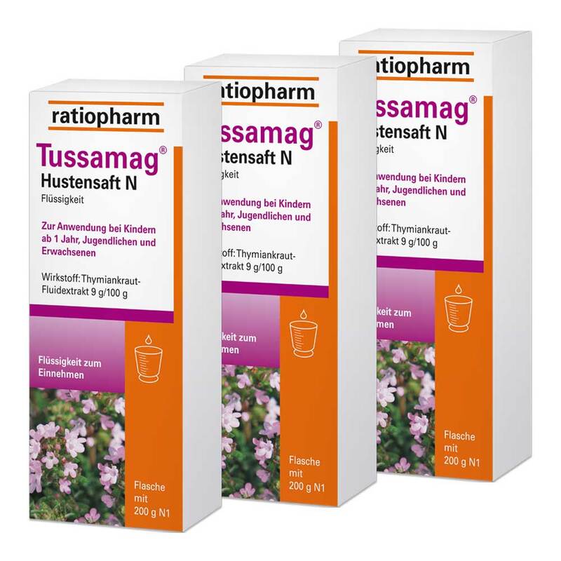 Tussamag® Hustensaft N Wirkstoff: Thymiankraut-Fluidextrakt. Anwendungsgebiete: Zur Besserung der Beschwerden bei Erkältungskrankheiten der Atemwege mit zähflüssigem Schleim und zur Besserung der Beschwerden bei akuter Bronchitis. Warnhinw.: AM enth.960 mg Alkohol (Ethanol) pro 30 ml, entspr. 32 mg/ml. -Hustensaft N zusätzl.: 7,4 mg Natriumbenzoat, 663 mg Saccharose u. 1,18 mg Natrium pro ml. -Hustensaft N zuckerfrei zusätzl.:7,55 g Sorbitol pro 25 ml. Apothekenpflichtig. Zu Risiken und Nebenwirkungen lesen Sie die Packungsbeilage und fragen Sie Ihre Ärztin, Ihren Arzt oder in Ihrer Apotheke. 11/22.