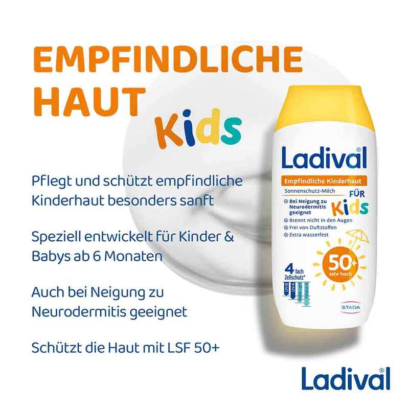 Kinderhaut ist besonders empfindlich gegenüber schädlichen UV-Strahlen und benötigt daher besonderen Schutz – vor allem, da Kinder viel Zeit im Freien verbringen. Ladival bietet hierfür die empfindliche Kinderhaut Sonnenschutz-Milch mit einem sehr hohen Lichtschutzfaktor von 50+ speziell formuliert für die empfindliche Haut von Kindern und Babys ab 6 Monaten.