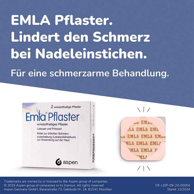 EMLA® Pflaster, wirkstoffhaltiges Pflaster (Wirkstoffe: Lidocain, Prilocain) Anwendungsgebiete: Bei Erwachsenen, Jugendlichen und Kindern: Betäubung der Haut vor a) einem Nadeleinstich, z. B. bei einer Injektion oder Blutabnahme; b) kleineren operativen Eingriffen an der Haut. Warnhinweise: Enthält Macrogolglycerolhydroxystearat. Stand: 12/2023 Aspen Pharma Trading Limited, 3016 Lake Drive, Citywest Business Campus, Dublin 24, Irland. Mitvertrieb: Aspen Germany GmbH, Balanstraße 73, 81541 München, Medical Hotline: +49 30 56 79 68 62 Email: aspenmedinfo@professionalinformation.co.uk Zu Risiken und Nebenwirkungen lesen Sie die Packungsbeilage und fragen Sie Ihre Ärztin, Ihren Arzt oder in Ihrer Apotheke.