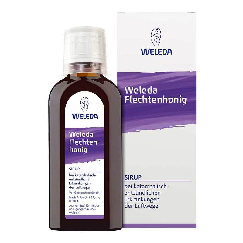 Pflichtangaben:Weleda Flechtenhonig Sirup.Warnhinweis: Enthält 80 mg Alkohol (Ethanol) pro 5 ml entsprechend 1,6 % (m/m). Enthält Saccharose und Invertzucker / Honig. Packungsbeilage beachten. Anwendungsgebiete gemäß der anthroposophischen Menschen- und Naturerkenntnis. Dazu gehören: Katarrhalisch-entzündliche Erkrankungen der Luftwege wie Luftröhrenentzündung (Tracheitis) und Bronchitis; Linderung des Hustenreizes und Schleimlösung. Zu Risiken und Nebenwirkungen lesen Sie die Packungsbeilage und fragen Sie Ihre Ärztin, Ihren Arzt oder in Ihrer Apotheke. Weleda AG, Schwäbisch Gmünd