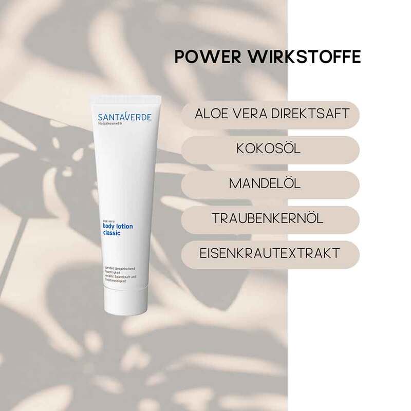Die leichte, frisch duftende Körperlotion schützt die Haut vor Feuchtigkeitsverlust und unterstützt ihre natürliche Regeneration. Reiner Aloe Vera Saft spendet langanhaltend Feuchtigkeit. Eisenkrautextrakt wirkt belebend, regenerierend und kräftigt die Hautstruktur. Öle aus Traubenkernen, Mandeln und Kokos pflegen, schützen und bewahren die Spannkraft und Geschmeidigkeit der Haut. Die schnell einziehende Lotion hinterlässt ein samtiges Hautgefühl. Geeignet für alle Hautbilder.
