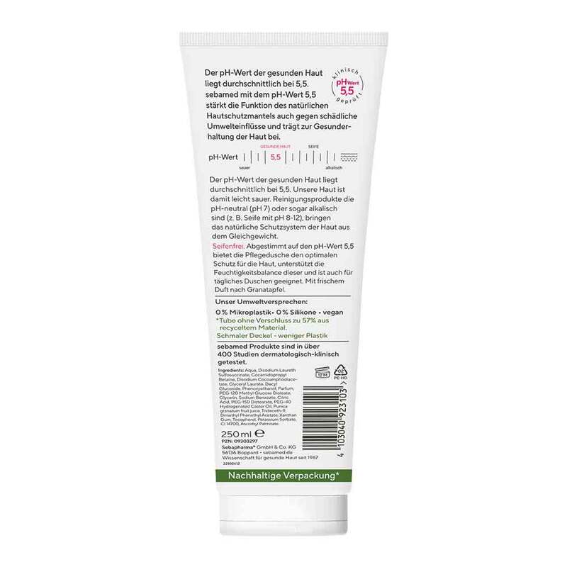 Das gesunde Wohlfühlerlebnis für empfindliche Haut - Die Sebamed Pflege-Dusche mit Granatapfel reinigt besonders schonend mit milden Zuckertensiden, stabilisiert die Feuchtigkeitsbalance der Haut, pflegt und erfrischt. Der pH-Wert 5,5 fördert den natürlichen Hautschutzmantel und unterstützt seine Barrierefunktion gegen Austrocknung und Reizungen