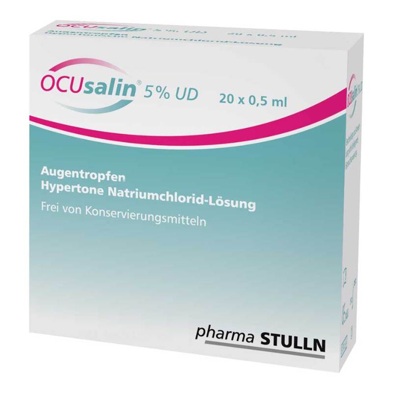 Ocusalin 5% UD ist eine sterile, hypertone Kochsalzlösung. Durch die physikalisch-osmotischen Eigenschaften entzieht sie die überschüssige Flüssigkeit und verbessert das Sehvermögen. Daher findet Ocusalin 5% Anwendung nach Augenoperationen, nach diagnostischen Eingriffen am Auge oder bei Hornhautödemen.
