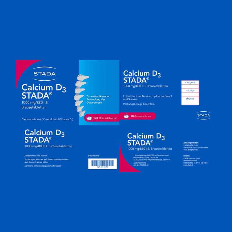 Calcium D3 STADA® 1000 mg/880 I.E. Brausetabletten. Wirkstoffe: Calciumcarbonat / Colecalciferol (Vitamin D3). Zum Ausgleich eines gleichzeitigen Calcium- und Vitamin D-Mangels bei älteren Menschen. Zur Unterstützung einer spezifischen Osteoporose-Behandlung bei Patienten mit nachgewiesenem oder hohem Risiko eines gleichzeitigen Calcium- und Vitamin D-Mangels. Enthält Lactose, Natriumverbindungen, hydriertes Sojaöl und Sucrose (Zucker). Zu Risiken und Nebenwirkungen lesen Sie die Packungsbeilage und fragen Sie Ihre Ärztin, Ihren Arzt oder in Ihrer Apotheke. Zulassungsinhaber: STADAPHARM GmbH, Stadastraße 2-18, 61118 Bad Vilbel. Vertrieb: STADA Consumer Health Deutschland GmbH, Stadastraße 2-18, 61118 Bad Vilbel. Stand: September 2019