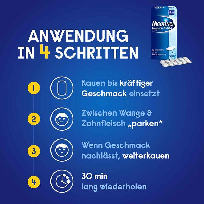Grundsätzlich gilt: Kauen Sie jeweils ein NICOTINELL Kaugummi, wenn Sie den Wunsch verspüren, zu rauchen. Im Allgemeinen sollte alle 1-2 Stunden 1 Kaugummi gekaut werden. Normalerweise sind 8-12 Stück pro Tag ausreichend. Falls Sie immer noch den Drang zum Rauchen verspüren, können Sie weitere Kaugummis kauen. Überschreiten Sie jedoch nicht eine Anzahl der NICOTINELL 4 mg Kaugummis von 15 Stück pro Tag.