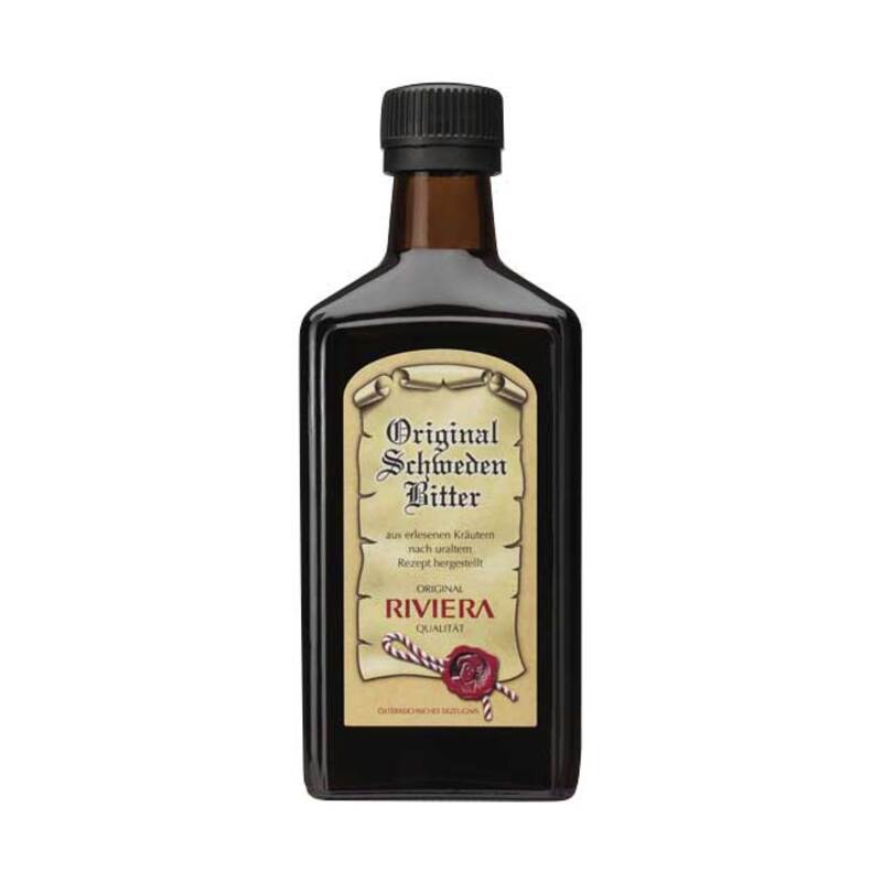 Original Schwedenbitter Riviera ist ein aus erlesenen Kräutern nach einem uralten Rezept hergestelltes Qualitätsprodukt. Die Bitterstoffe von Wermutkraut und Enzianwurzel sorgen für den typischen Geschmack.