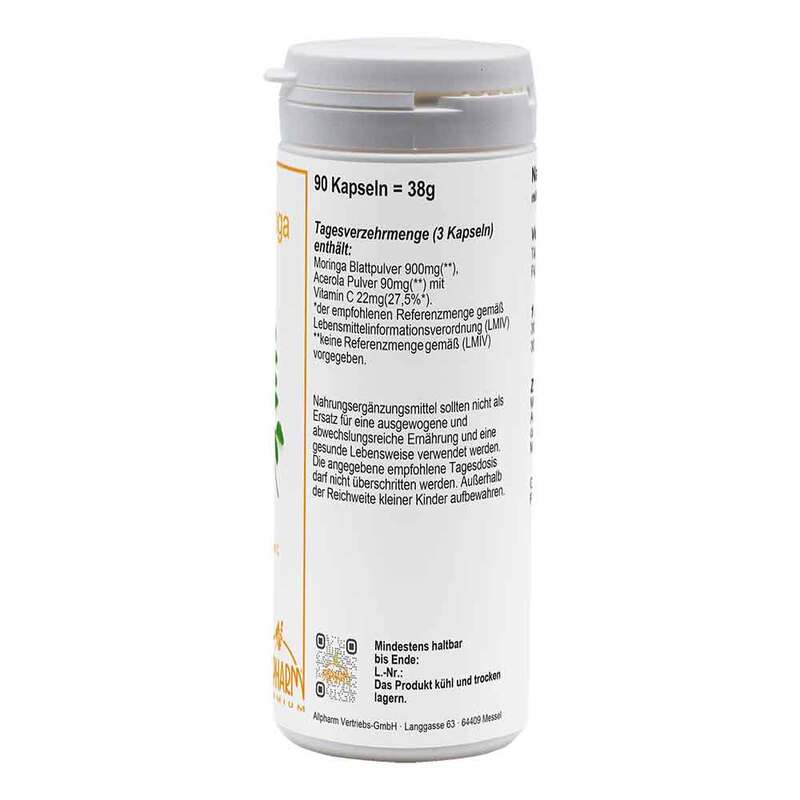 Moringa Blattpulver, Acerola Pulver, Ascorbinsäure, Hydroxypropylmethylcellulose (vegane Kapselhülle), Maltodextrin.
