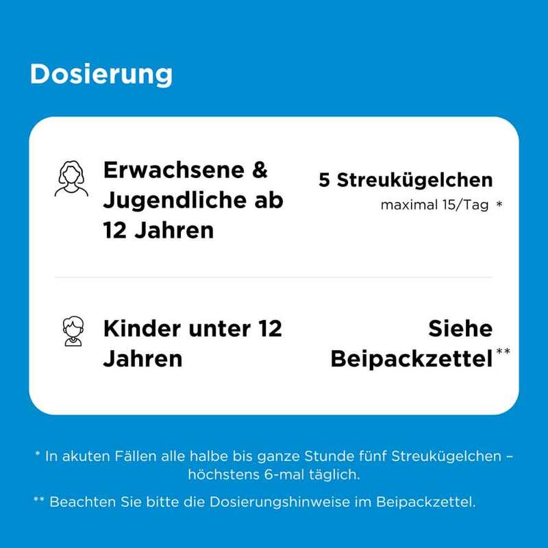 Jugendliche ab 12 Jahren und Erwachsene erhalten als Akutdosierung alle halbe bis ganze Stunde, höchstens 6-mal täglich je 5 Globuli (maximal 30 Globuli/Tag), bei länger andauernden Verlaufsformen 1- bis 3-mal täglich 5 Globuli (maximal 15 Globuli/Tag).