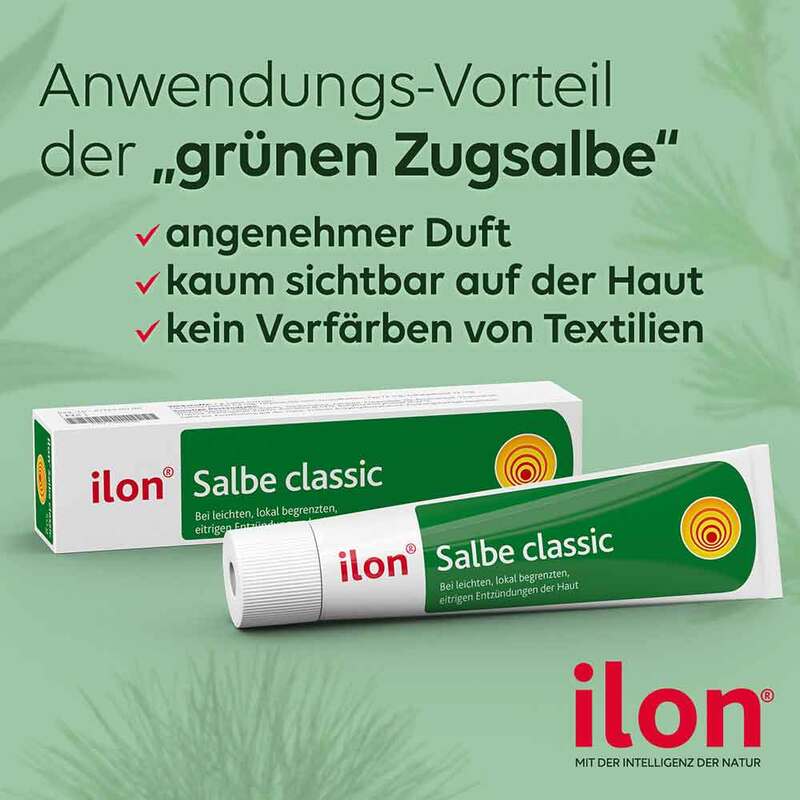 Bei „schwarzen“ Zugsalben handelt es sich um Mono-Präparate, die je nach Anwendungsgebiet den Wirkstoff Ammoniumbituminosulfonat (sulfoniertes Schieferöl) in unterschiedlicher Konzentration enthalten. ilon® Salbe classic basiert auf einer pflanzlichen Wirkstoffkombination. Sie vereint die Eigenschaften von Lärchenterpentin, gereinigtem Terpentinöl und ätherischen Ölen aus Eukalyptus, zu einem entzündungshemmenden, desinfizierenden und durchblutungsfördernden Wirkstoff-Komplex. Durch die Anwendung von ilon® Salbe classic wird die Haut weicher, der Eiter kann auf natürlich-schonende Weise abfließen.