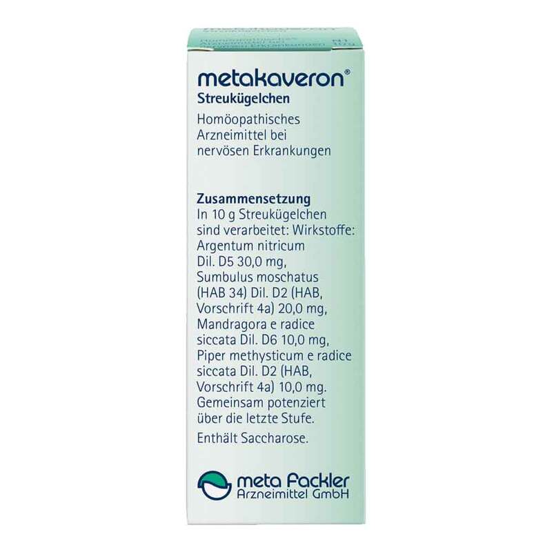 Pflichtangaben:Metakaveron Globuli.Die Anwendungsgebiete leiten sich von den homöopathischen Arzneimittelbildern ab. Dazu gehören: vegetativ und nervös bedingte Störungen. Enthält: Succrose/Zucker. Zu Risiken und Nebenwirkungen lesen Sie die Packungsbeilage und fragen Sie Ihre Ärztin, Ihren Arzt oder in Ihrer Apotheke.