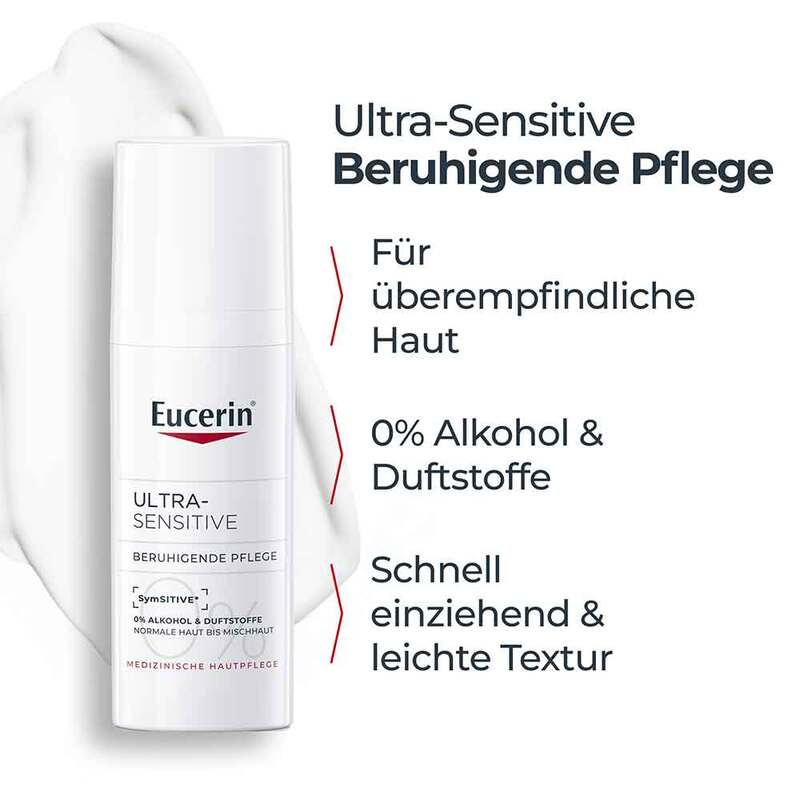 Bei der Entwicklung der Eucerin UltraSENSITIVE Beruhigende Pflege wurde speziell auf die Bedürfnisse empfindlicher Haut sowie ihre Symptome geachtet. Hierzu gehört zum Beispiel eine Schwächung der Hautschutzbarriere, wodurch es sein kann, dass die Haut schneller gereizt, irritiert oder gerötet reagiert. Die Gesichtscreme für normale Haut und Mischhaut pflegt mit ihrer sanften Formel sowie dem innovativen Wirkstoff SymSitive. Dieser fortschrittliche Wirkstoff sorgt dafür, dass die Toleranzschwelle sensibler Haut erhöht sowie irritierte Haut beruhigt wird. Die Pflegecreme ist bestens zur Anwendung als Tagescreme und auch als Nachtcreme geeignet.
