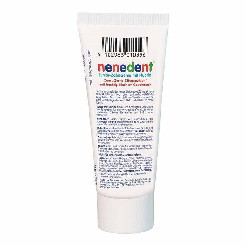 Nenedent Junior-Zahncreme wurde von der Dentinox-Forschung speziell für den Wechsel von Milchzähnen zu bleibenden Zähnen für Kinder von 6 - 12 Jahren entwickelt. Sie härtet den Zahnschmelz mit 1.450 ppm Fluorid und hemmt mit 13 % Xylit gezielt das Wachstum der Kariesbakterien.