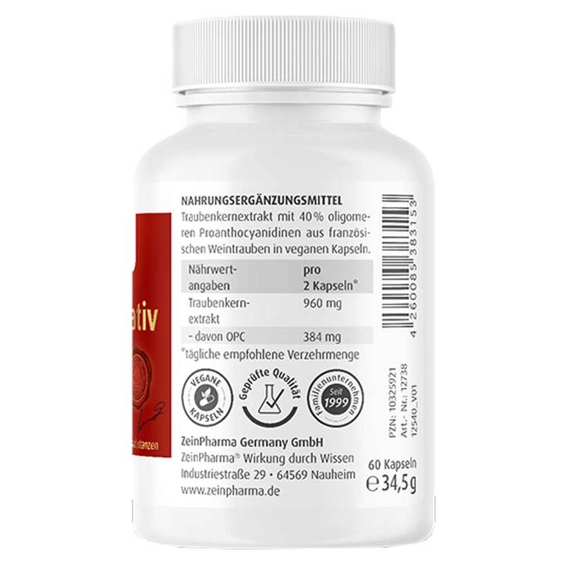 Inhaltsstoffe: Traubenkernextrakt pro 2 Kapseln: 960 mg; davon oligomere Proanthocyanidine 384 mg