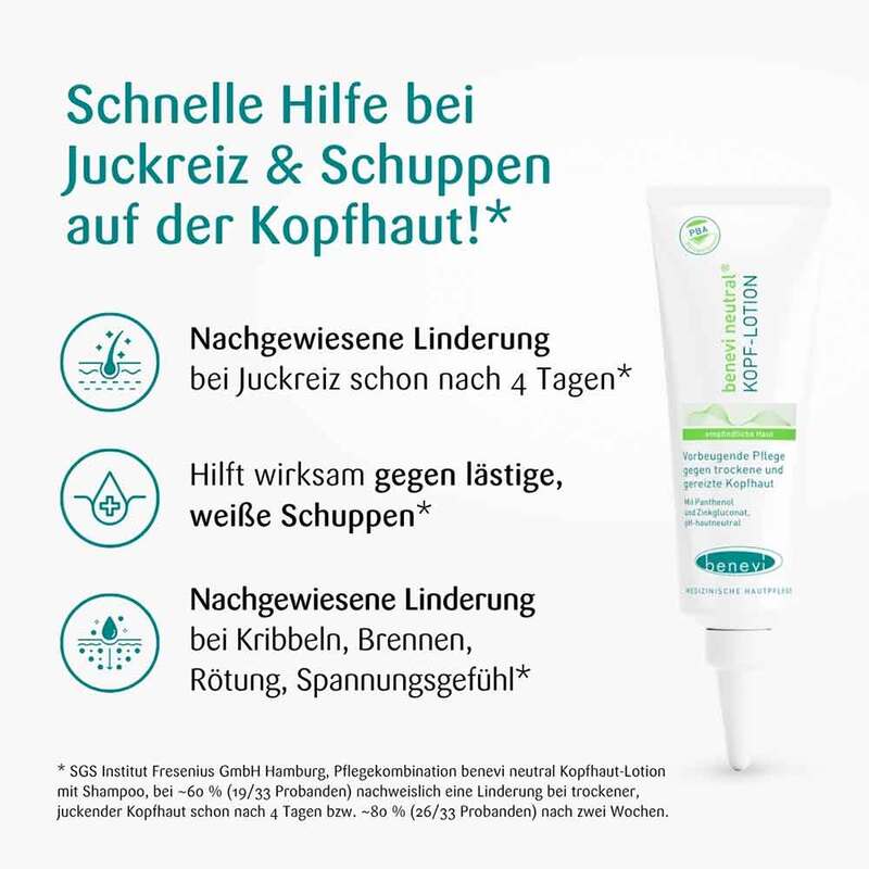 Trockene Kopfhaut ist eine häufige Ursache für Juckreiz und weiße Schuppen. Die Benevi Neutral Kopf-Lotion wurde speziell entwickelt, um genau hier anzusetzen: Sie spendet gezielt Feuchtigkeit, beruhigt irritierte Hautpartien und hilft so, Juckreiz und Schuppenbildung zu mindern – ganz ohne Auswaschen.