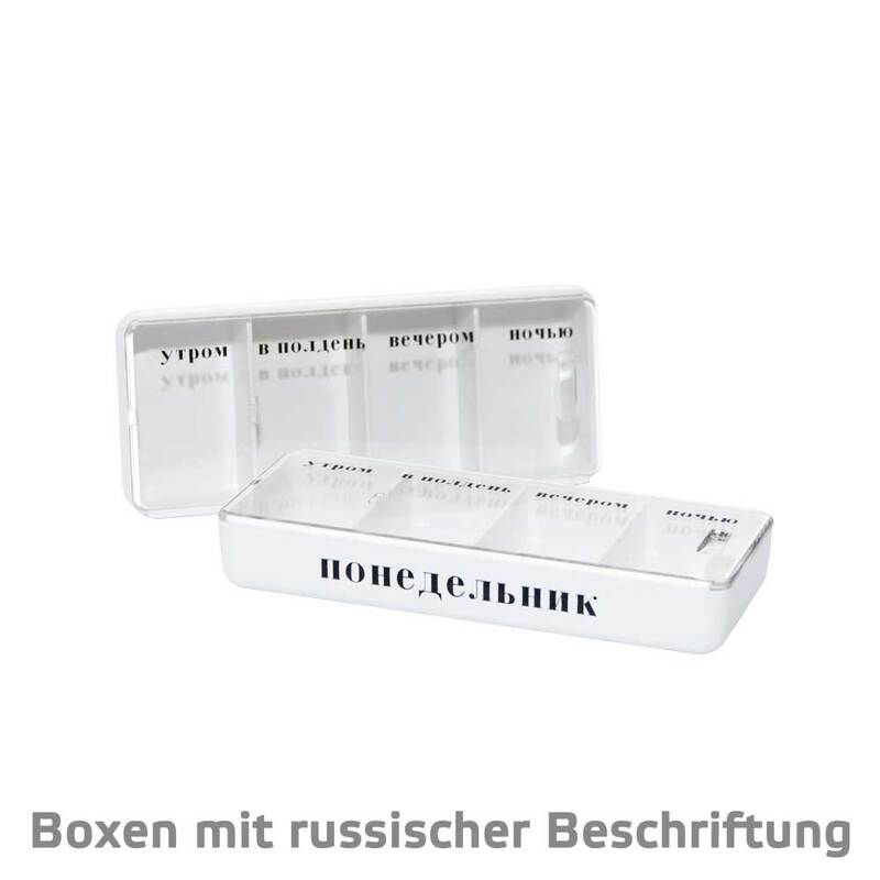 Die Beschriftung der einzelnen Tablettenboxen ist in kyrillischen Buchstaben.