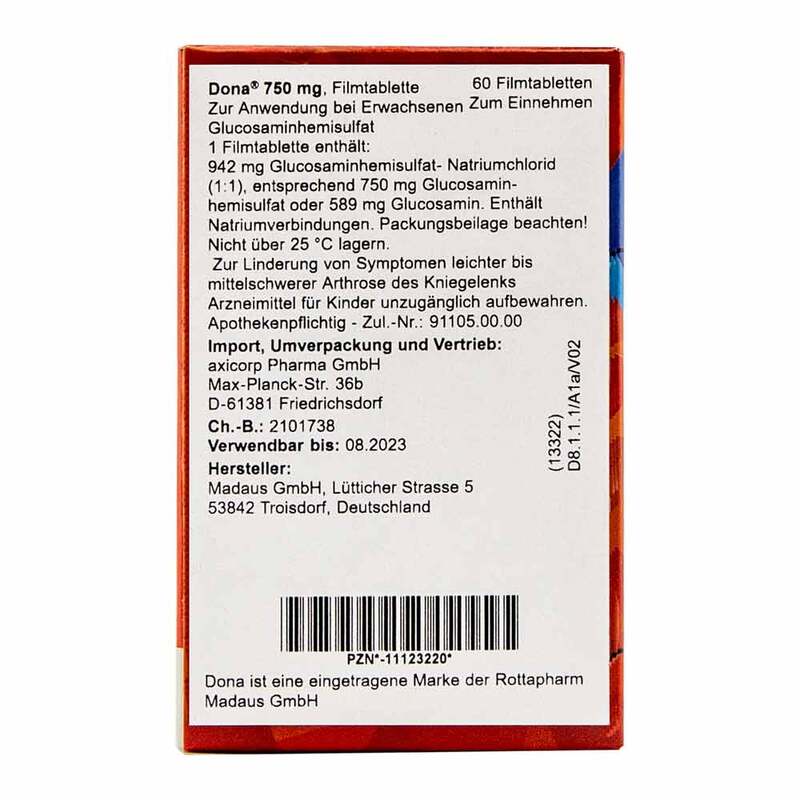 dona 750 mg Filmtabletten. Anw.: Linderung von Symptomen leichter bis mittelschwerer Arthrose des Kniegelenks. Wirkstoff: Glucosaminhemisulfat. Zu Risiken und Nebenwirkungen lesen Sie die Packungsbeilag und fragen Sie Ihre Ärztin, Ihren Arzt oder in Ihrer Apotheke. Stand 11/22.