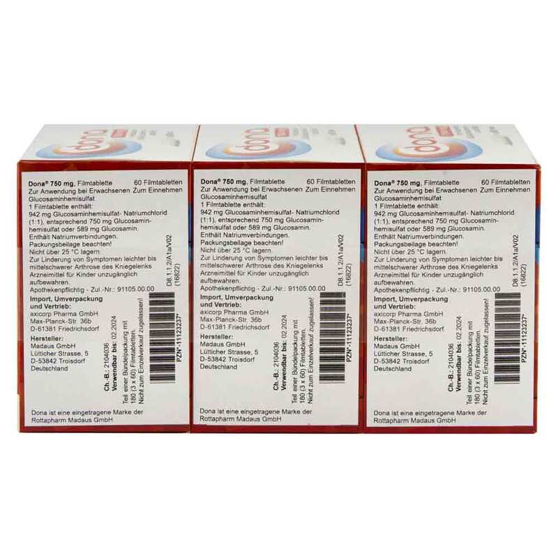 dona 750 mg Filmtabletten. Anw.: Linderung von Symptomen leichter bis mittelschwerer Arthrose des Kniegelenks. Wirkstoff: Glucosaminhemisulfat. Zu Risiken und Nebenwirkungen lesen Sie die Packungsbeilag und fragen Sie Ihre Ärztin, Ihren Arzt oder in Ihrer Apotheke. Stand 11/22.