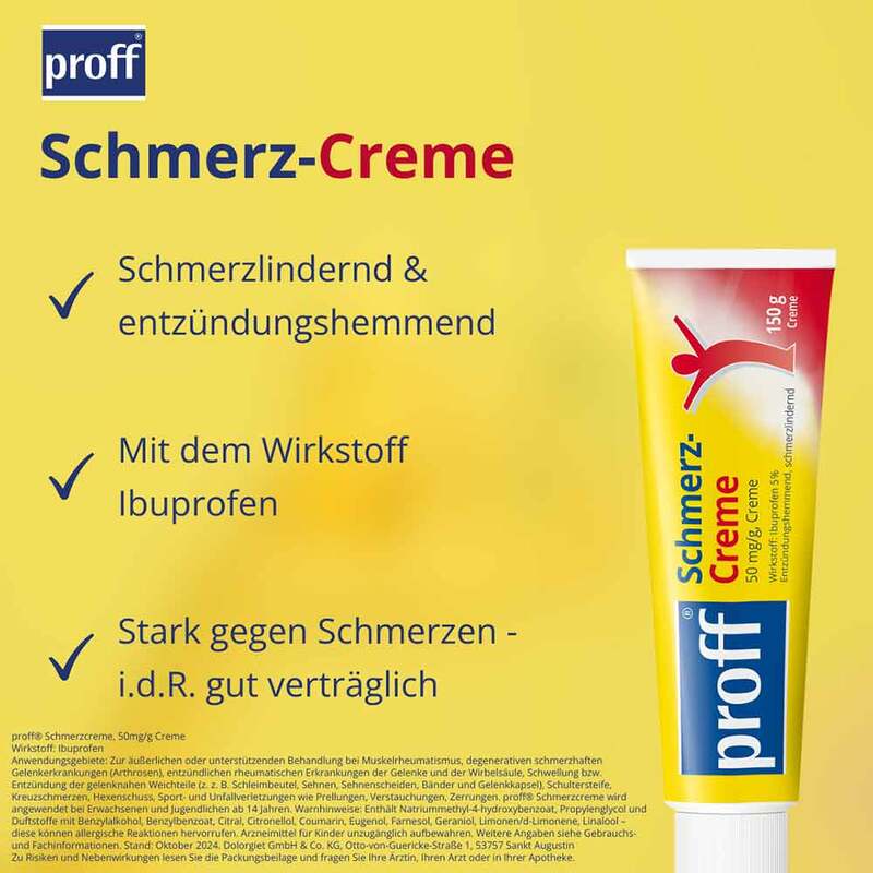 proff® Schmerzcreme, 50mg/g Creme Wirkstoff: Ibuprofen Anwendungsgebiete: Zur äußerlichen oder unterstützenden Behandlung bei Muskelrheumatismus, degenerativen schmerzhaften Gelenkerkrankungen (Arthrosen), entzündlichen rheumatischen Erkrankungen der Gelenke und der Wirbelsäule, Schwellung bzw. Entzündung der gelenknahen Weichteile (z. z. B. Schleimbeutel, Sehnen, Sehnenscheiden, Bänder und Gelenkkapsel), Schultersteife, Kreuzschmerzen, Hexenschuss, Sport- und Unfallverletzungen wie Prellungen, Verstauchungen, Zerrungen. proff® Schmerzcreme wird angewendet bei Erwachsenen und Jugendlichen ab 14 Jahren. Warnhinweise: Enthält Natriummethyl-4-hydroxybenzoat, Propylenglycol und Duftstoffe mit Benzylalkohol, Benzylbenzoat, Citral, Citronellol, Coumarin, Eugenol, Farnesol, Geraniol, Limonen/d-Limonene, Linalool – diese können allergische Reaktionen hervorrufen. Arzneimittel für Kinder unzugänglich aufbewahren. Weitere Angaben siehe Gebrauchs- und Fachinformationen. Stand: Oktober 2024. Dolorgiet GmbH & Co. KG, Otto-von-Guericke-Straße 1, 53757 Sankt Augustin Zu Risiken und Nebenwirkungen lesen Sie die Packungsbeilage und fragen Sie Ihre Ärztin, Ihren Arzt oder in Ihrer Apotheke.