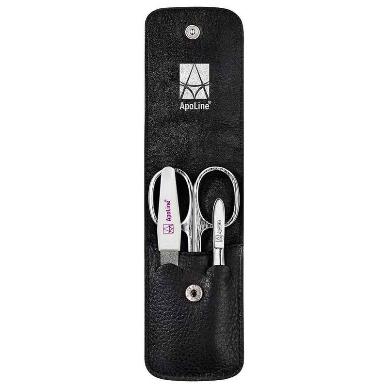 Das ApoLine®Pflege-Etui besteht aus hochwertigen Leder und ist in den Farben schwarz und lila erhältlich. Jedes Etui ist bestückt mit einer ApoLine®Nagelschere, einer 10 cm Saphir-Nagelfeile und eine Pinzette mit schräger Spitze. Ideal für unterwegs, für die Handtasche oder auf Reisen.
