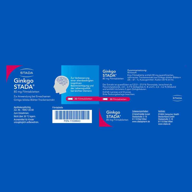 Ginkgo STADA® 80 mg Filmtabletten. Zur Anwendung bei Erwachsenen. Wirkstoff: Ginkgo-biloba-Blätter-Trockenextrakt. Ginkgo STADA® ist ein pflanzliches Arzneimittel zur Verbesserung einer altersbedingten kognitiven Beeinträchtigung und der Lebensqualität bei leichter Demenz. Enthält Lactose und Glucose. Zu Risiken und Nebenwirkungen lesen Sie die Packungsbeilage und fragen Sie Ihre Ärztin, Ihren Arzt oder in Ihrer Apotheke. Zulassungsinhaber: STADAPHARM GmbH, Stadastraße 2–18, 61118 Bad Vilbel. Vertrieb: STADA Consumer Health Deutschland GmbH, Stadastraße 2–18, 61118 Bad Vilbel. Stand: Juli 2020
