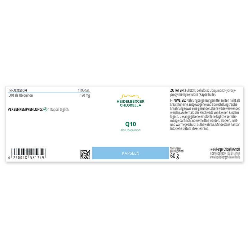Füllstoff: Cellulose, Q10 als Ubiquinon Pulver (24 %), Hydroxypropylmethylcellulose (Kapselhülle).
