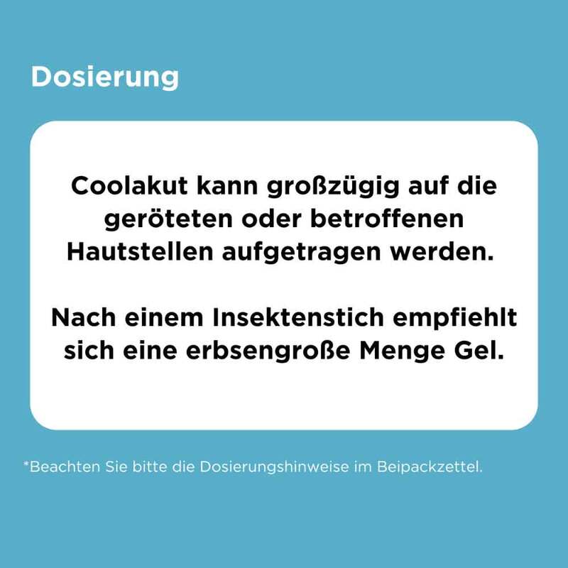 Coolakut® pflegt und beruhigt die gereizte Haut, reduziert dadurch den Juckreiz und wirkt dabei angenehm kühlend. Das Gel hat einen angenehm wohltuenden pflegenden und feuchtigkeitsspendenden Effekt.