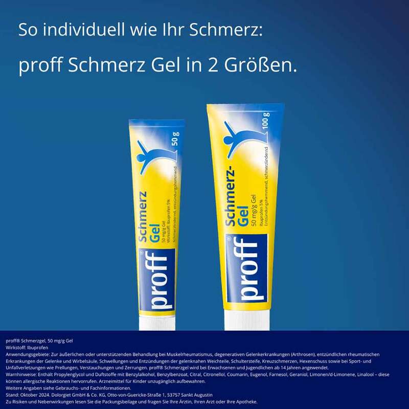 proff® Schmerzgel, 50 mg/g Gel Wirkstoff: Ibuprofen Anwendungsgebiete: Zur äußerlichen oder unterstützenden Behandlung bei Muskelrheumatismus, degenerativen Gelenkerkrankungen (Arthrosen), entzündlichen rheumatischen Erkrankungen der Gelenke und Wirbelsäule, Schwellungen und Entzündungen der gelenknahen Weichteile, Schultersteife, Kreuzschmerzen, Hexenschuss sowie bei Sport- und Unfallverletzungen wie Prellungen, Verstauchungen und Zerrungen. proff® Schmerzgel wird bei Erwachsenen und Jugendlichen ab 14 Jahren angewendet. Warnhinweise: Enthält Propylenglycol und Duftstoffe mit Benzylalkohol, Benzylbenzoat, Citral, Citronellol, Coumarin, Eugenol, Farnesol, Geraniol, Limonen/d-Limonene, Linalool – diese können allergische Reaktionen hervorrufen. Arzneimittel für Kinder unzugänglich aufbewahren. Weitere Angaben siehe Gebrauchs- und Fachinformationen. Stand: Oktober 2024. Dolorgiet GmbH & Co. KG, Otto-von-Guericke-Straße 1, 53757 Sankt Augustin Zu Risiken und Nebenwirkungen lesen Sie die Packungsbeilage und fragen Sie Ihre Ärztin, Ihren Arzt oder Ihre Apotheke.