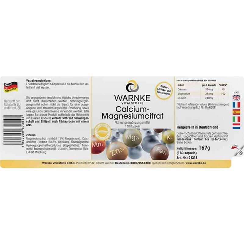 Magnesiumcitrat (enthält 16% Magnesium), Calciumcitrat (enthält 20,8% Calcium), Überzugsmittel Hydroxypropylmethylcellulose (Kapselhülle), L-Leucin, Füllstoff mikrokristalline Cellulose.