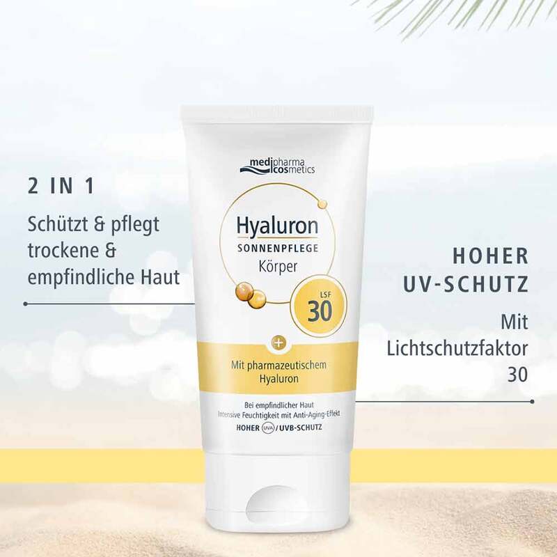 Die Hyaluron Sonnenpflege Körper LSF 30 von medipharma cosmetics bietet empfindlicher und trockener Haut zuverlässigen Schutz und intensive Feuchtigkeitspflege bei starker Sonneneinstrahlung.