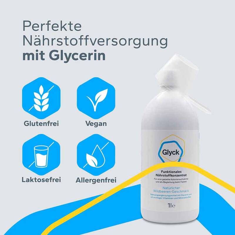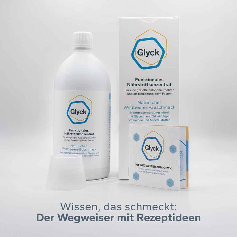 Flasche vor Gebrauch gut schütteln. Einen Messbecher (75 ml) Glyck®-Nährstoffkonzentrat mit 1 Liter Trinkwasser verdünnen. Empfohlene Tagesdosis: 2 Liter des verzehrfertigen Getränks, hergestellt aus 150 ml Glyck®-Nährstoffkonzentrat. Je nach Geschmacksvorlieben kann das Getränk mit kohlensäurehaltigem oder kohlesäurefreiem Mineral- oder Trinkwasser zubereitet werden.
