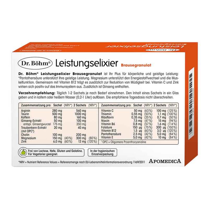 Job, Familie, Freizeit – Tag für Tag sind wir gefordert, Leistungen zu erbringen. Kein Wunder, dass wir uns manchmal müde, erschöpft und ausgelaugt fühlen können. Wenn Leistung, Konzentration und Ausdauer gefragt sind, kann ein belebender Muntermacher für Körper und Geist sehr wertvoll sein. Mit Dr. Böhm Leistungselixier Brausegranulat versorgen Sie Ihren Körper mit Vitaminen, Mineralstoffen, Aminosäuren, OPC und Ginseng. So tragen Sie zum Erhalt Ihrer Leistung bei.