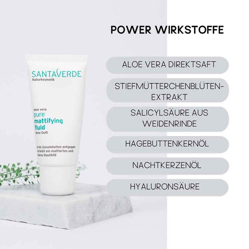 Das mattierende Fluid pflegt die Haut, wirkt Unreinheiten entgegen und beugt ihrer Neuentstehung vor. Reiner Aloe Vera Saft und Hyaluron spenden und binden intensiv Feuchtigkeit und schützen die Hautbarriere. Entzündungshemmender Stiefmütterchenblütenextrakt sowie talgregulierende Salicylsäure aus Weidenrinde wirken verstopften Poren und glänzenden Hautpartien entgegen. Beruhigende Öle aus Nachtkerze und Hagebutte lindern Rötungen und haben einen schützenden Pflegeeffekt. Die feine Textur zieht schnell ein und hinterlässt die sensible, zu Glanz neigende und unreine Haut mattiert, rein und klar.