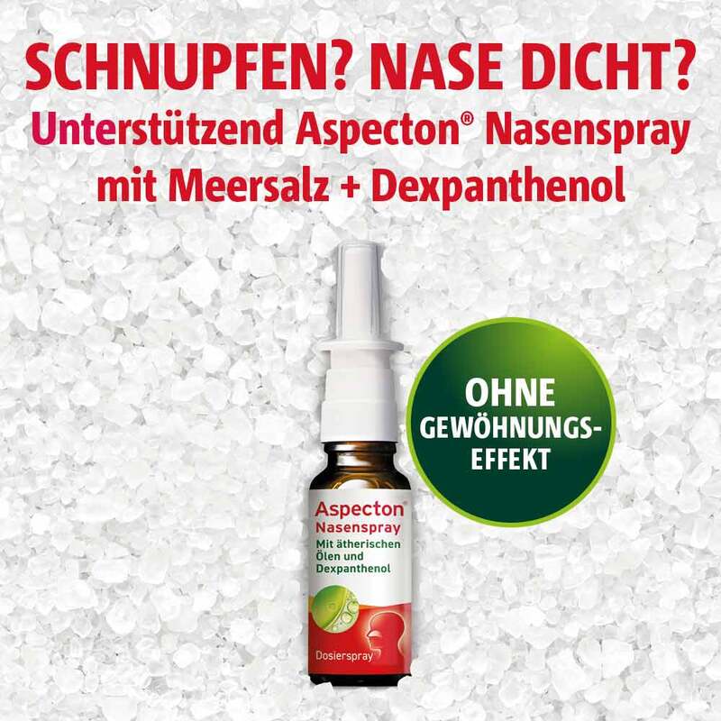 Anders als reine Meersalzsprays beinhaltet Aspecton® Nasenspray eine einzigartige Kombination aus einer hypertonen Meersalzlösung (emtspricht einer 1,5 %igen Kochsalz-Lösung), pflegendem Dexpanthenol, befeuchtender und schützender Hypromellose sowie ätherischen Ölen (u.a. Thymian-, Eukalyptus- und Minzöl).