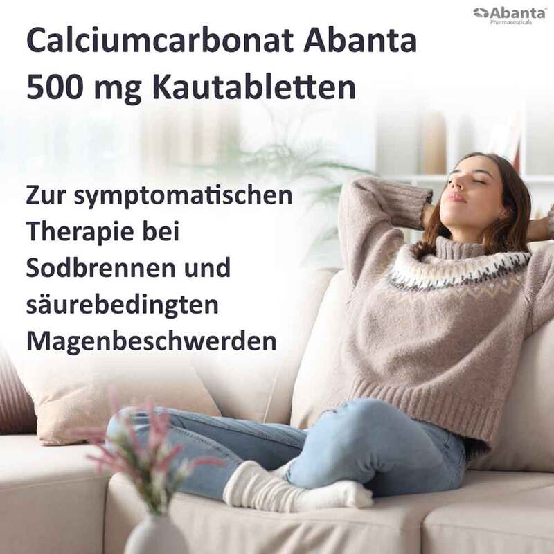 Calciumcarbonat Abanta 500 mg Kautabletten Wirkstoff: Calciumcarbonat Anwendungsgebiete: Zur symptomatischen Therapie bei Sodbrennen und säurebedingten Magenbeschwerden. Anwendung nur in Verbindung mit anderen Antacida. Warnhinweise: Enthält Lactose. Pharmazeutischer Unternehmer: Abanta Pharma GmbH, Reichsstraße 78, 58840 Plettenberg Zu Risiken und Nebenwirkungen lesen Sie die Packungsbeilage und fragen Sie Ihre Ärztin, Ihren Arzt oder in Ihrer Apotheke.