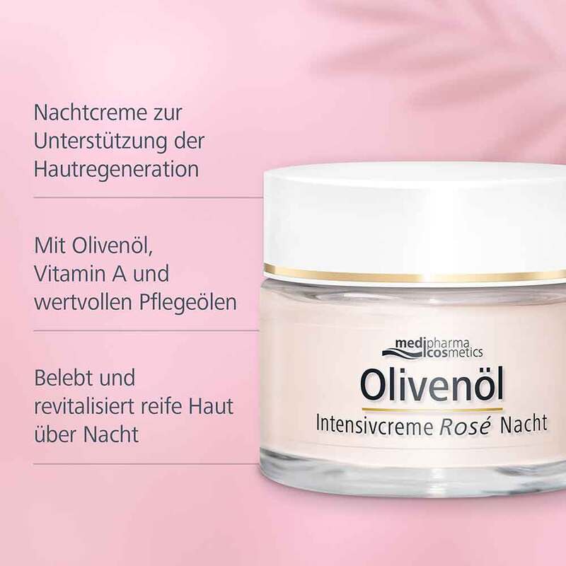 Die Nachtcreme der Olivenöl Intensivcreme Rosé mit ihren sorgfältig abgestimmten Kompositionen aus hochwertigen Pflegeölen, wie z.B. wertvollem Olivenöl und festigenden Wirkstoffen, glättet und reduziert Falten. Der Teint erscheint am nächsten Morgen strahlend, geschmeidiger und fester.