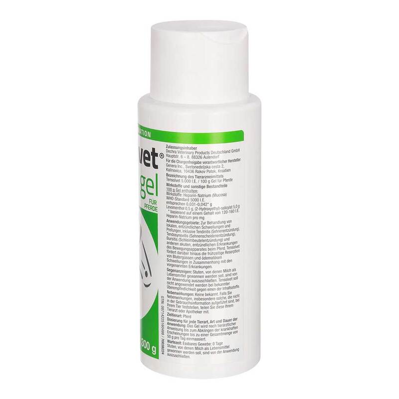 Anwendungsgebiete: Zur Behandlung von lokalen, entzündlichen Schwellungen und Prellungen, inklusive Tendinitis(Sehnenentzündung), Tendosynovitis (Sehnenscheidenentzündung), Bursitis (Schleimbeutelentzündung) und anderen akuten, entzündlichen Erkrankungen des Bewegungsapparates beim Pferd. Tensolvet fördert darüber hinaus die frühzeitige Resorption von Blutergüssen und ödematösen Schwellungen in Zusammenhang mit den vorgenannten Erkrankungen.