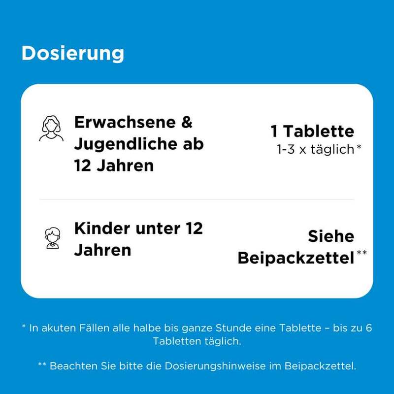 Soweit nicht anders verordnet, bei akuten Beschwerden alle halbe bis ganze Stunde, höchstens 6-mal täglich, 1 Tablette einnehmen. Nach Besserung der akuten Beschwerden 1- bis 3-mal täglich 1 Tablette anwenden. Kinder zwischen dem 6. und dem 12. Lebensjahr erhalten nicht mehr als zwei Drittel der Erwachsenendosis.