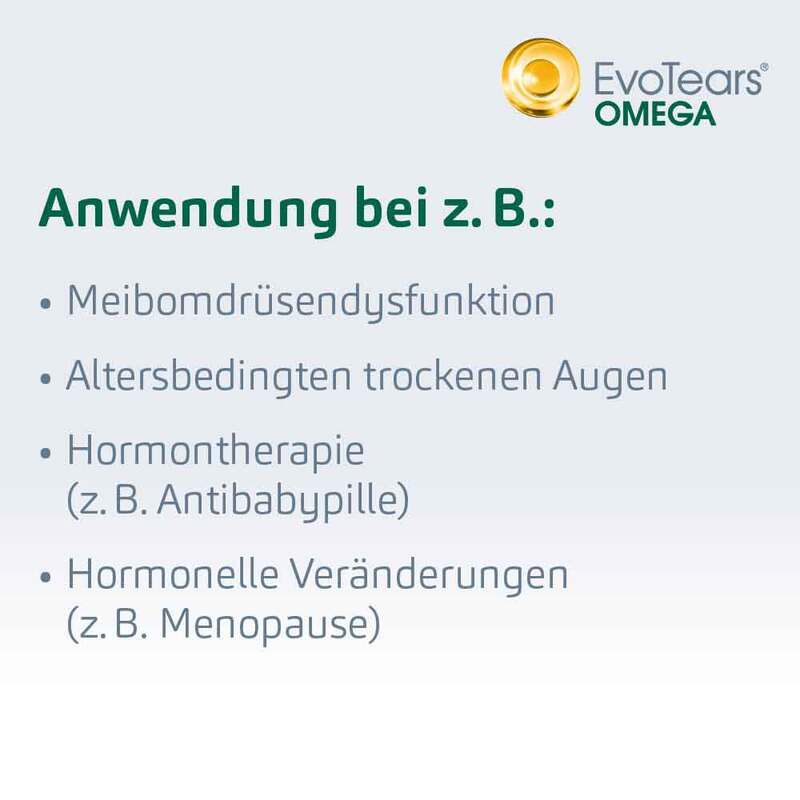 Trockene und gereizte Augen, mit z. B. geröteten, schmerzenden Lidrändern bzw. verkrusteten Augenlidern nach dem Aufwachen, können auf eine eingeschränkte Funktion der Meibomdrüsen hinweisen. Diese führt zur Beeinträchtigung der Lipid(Öl)phase, die den Tränenfilm vor Verdunstung schützt, und gilt als Hauptursache für trockene Augen.2 EvoTears® OMEGA geht trockene Augen aufgrund einer Meibomdrüsendysfunktion gezielt an. Die Augentropfen vereinen effektiven Verdunstungsschutz, dank des innovativen Inhaltsstoffs Perfluorhexyloctan und Vorteile der Wasserfreiheit mit Omega-3-Fettsäuren zur Linderung gereizter Augen und Lidränder. Aufgrund der geringen Oberflächenspannung verteilen sich die Augentropfen schnell auf dem Tränenfilm und bilden einen filigranen Schutzmantel auf der Träne. Somit wird einer vorzeitigen Verdunstung langanhaltend entgegengewirkt. Im Vergleich zu wasserhaltigen Präparaten sind die Tropfen deutlich kleiner. EvoTears® OMEGA ist deshalb sehr ergiebig und, dank der Öl-ähnlichen Eigenschaften, ist die Anwendung der Augentropfen kaum spürbar. Aufgrund der wasserfreien Formulierung besteht kein Bedarf an Hilfsstoffen.
